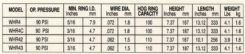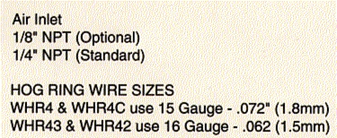 The WHR4 & WHR4C Series for use in upholstering furniture, automotive seat construction, or wherever a round tight ring of a heavy gauge is required. WHR43 & WHR42 Series used in the assembly of removable insulation blankets, animal cages, elastic cord assemblies, etc. The hog rings are formed into a tight double wrapped pattern.
